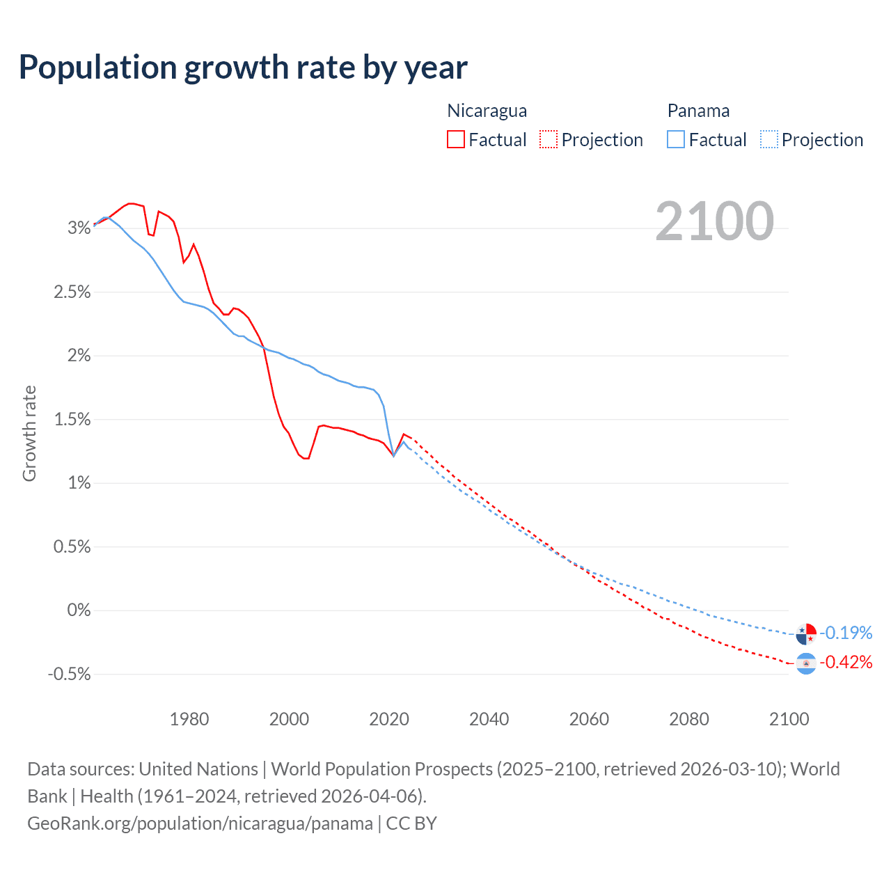 - For the last 10 years, Nicaragua has had an average growth rate of +1.33% per year vs +1.52% in Panama.