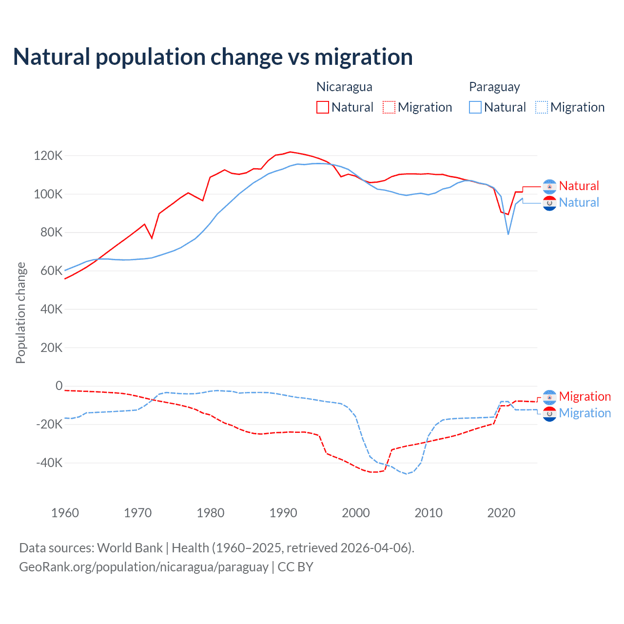 Over the last 10 years, 85.5% of the population change in Nicaragua is from natural causes (a gain of 1,017,084 people) and 14.5% is from migration (a loss of 172,078 people). In Paraguay 87.6% is from natural causes (a gain of 1,002,636 people) and 12.4% is from migration (a loss of 141,377 people).