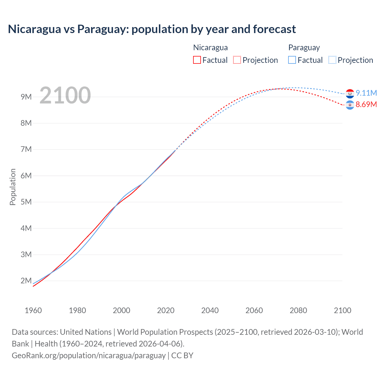 The latest officially reported population of Nicaragua was 6,916,140 in 2024 vs 6,929,153 people in Paraguay in 2024. In 2026, based on the adjusted UN estimation, the current Nicaragua's population is 7,124,343 people compared to 7,120,169 in Paraguay.