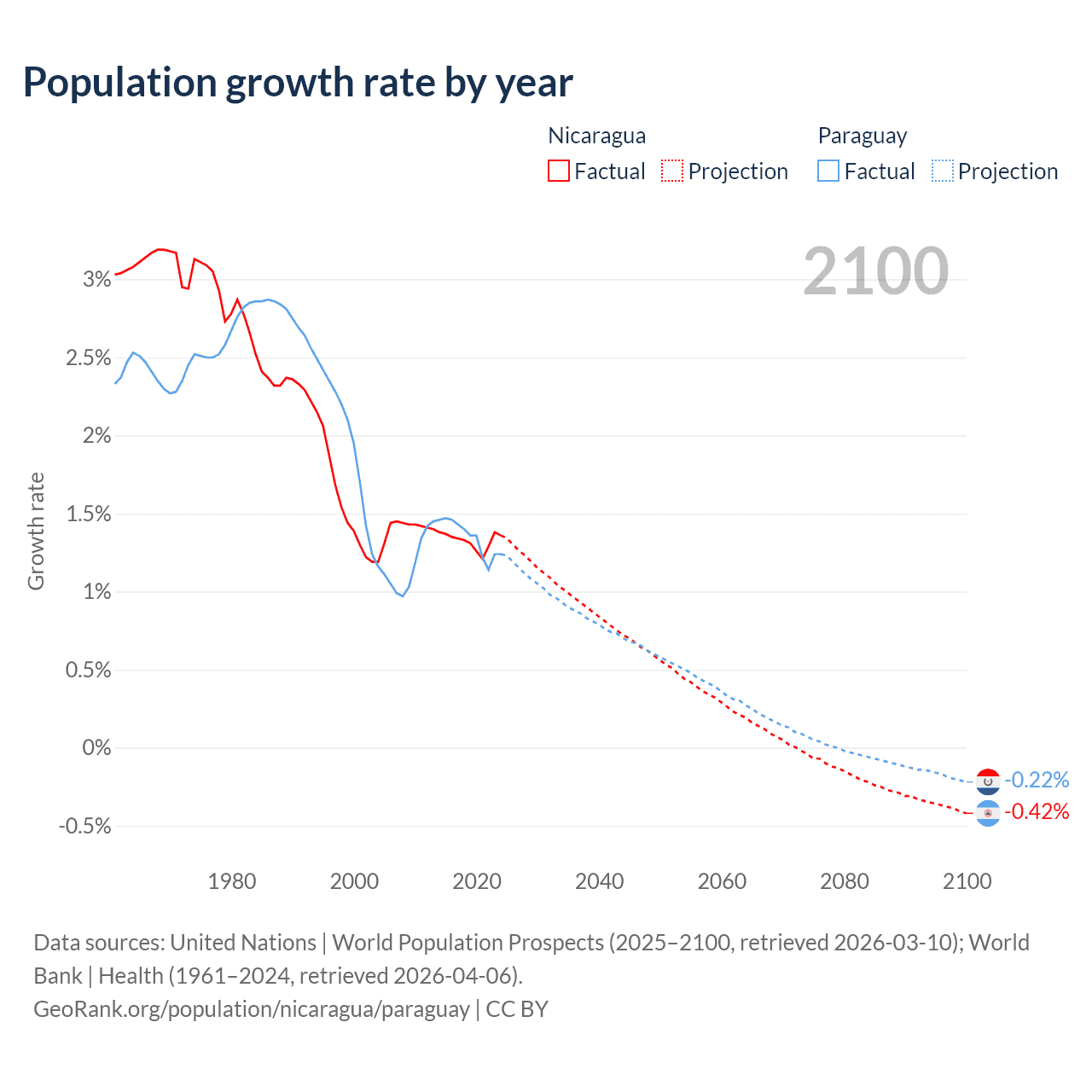 - For the last 10 years, Nicaragua has had an average growth rate of +1.33% per year vs +1.34% in Paraguay.