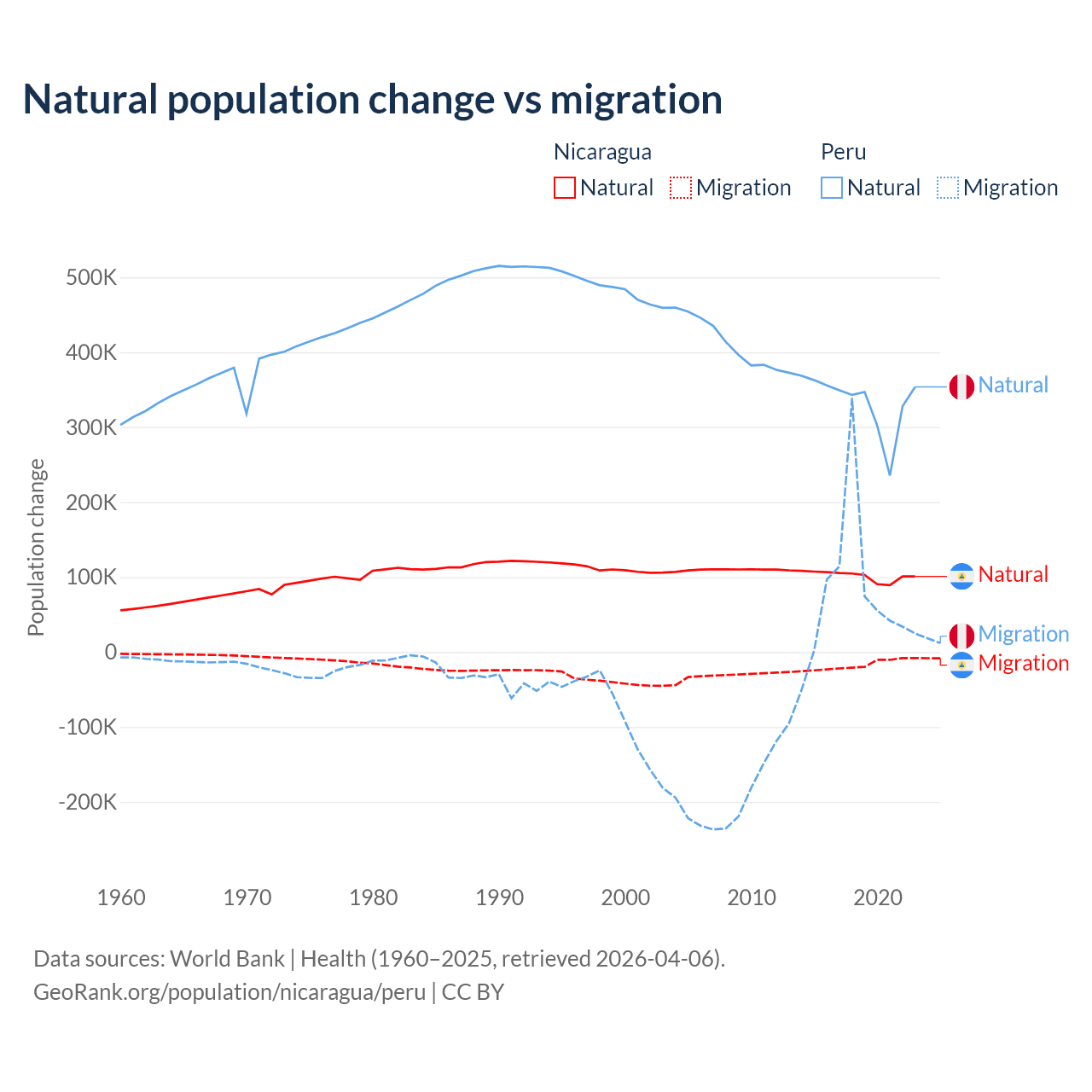 Over the last 10 years, 85.5% of the population change in Nicaragua is from natural causes (a gain of 1,017,084 people) and 14.5% is from migration (a loss of 172,078 people). In Peru 82% is from natural causes (a gain of 3,345,822 people) and 18% is from migration (a gain of 732,505 people).