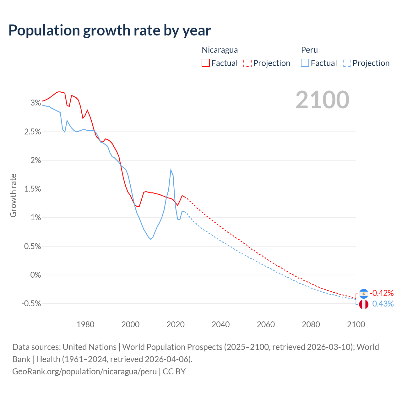 - For the last 10 years, Nicaragua has had an average growth rate of +1.33% per year vs +1.26% in Peru.