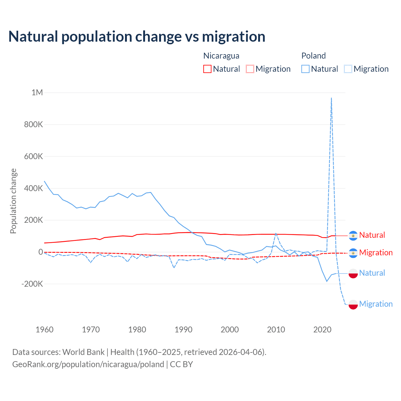 Over the last 10 years, 85.5% of the population change in Nicaragua is from natural causes (a gain of 1,017,084 people) and 14.5% is from migration (a loss of 172,078 people). In Poland 41.4% is from natural causes (a loss of 675,443 people) and 58.6% is from migration (a gain of 955,766 people).