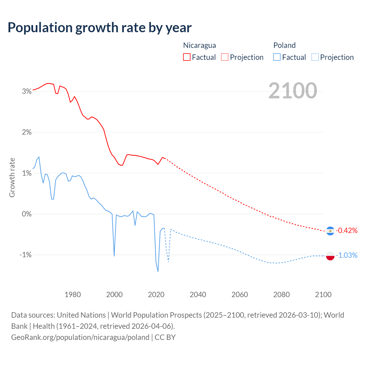 - For the last 10 years, Nicaragua has had an average growth rate of +1.33% per year vs -0.36% in Poland.