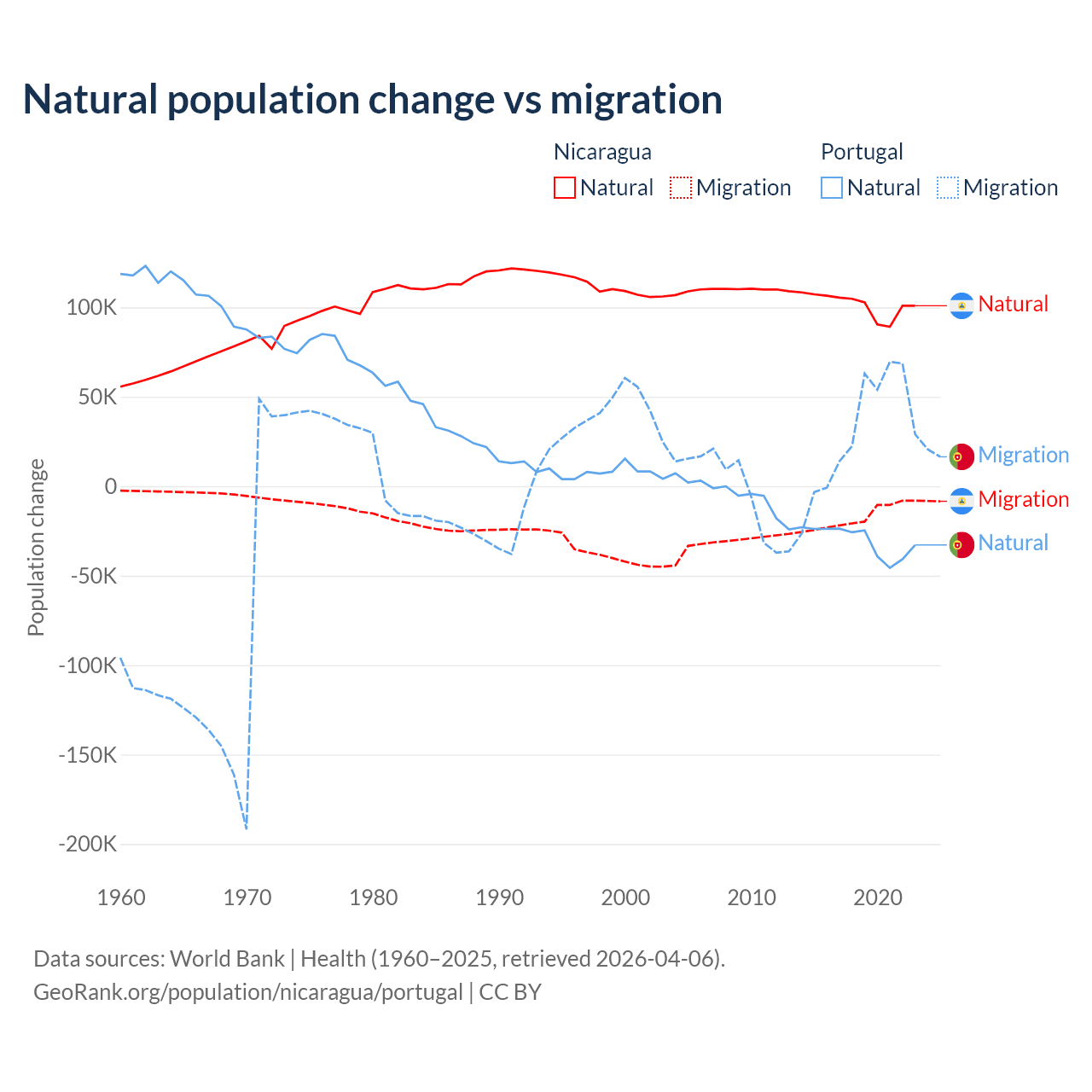 Over the last 10 years, 85.5% of the population change in Nicaragua is from natural causes (a gain of 1,017,084 people) and 14.5% is from migration (a loss of 172,078 people). In Portugal 51% is from natural causes (a loss of 302,748 people) and 49% is from migration (a gain of 290,554 people).