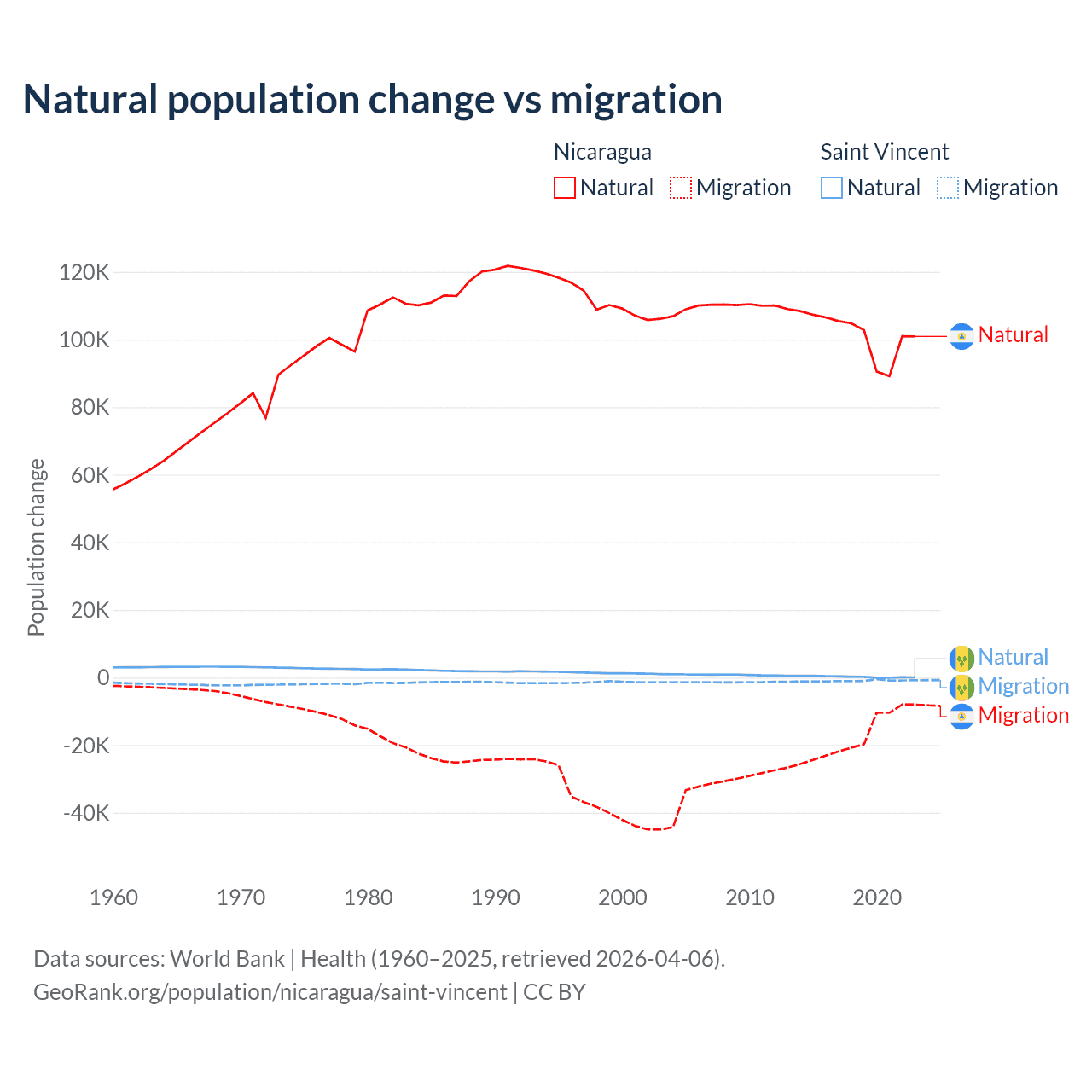 Over the last 10 years, 85.5% of the population change in Nicaragua is from natural causes (a gain of 1,017,084 people) and 14.5% is from migration (a loss of 172,078 people). In Saint Vincent 21.2% is from natural causes (a gain of 2,525 people) and 78.8% is from migration (a loss of 9,393 people).