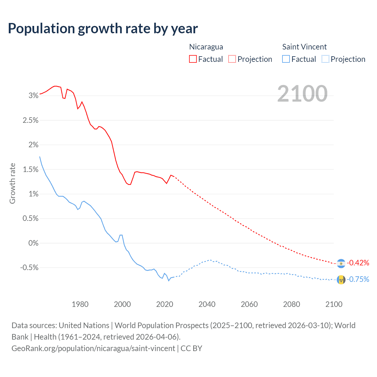 - For the last 10 years, Nicaragua has had an average growth rate of +1.33% per year vs -0.65% in Saint Vincent.