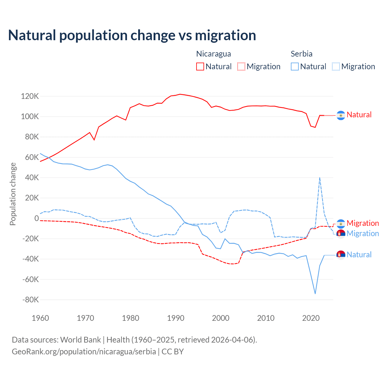 Over the last 10 years, 85.5% of the population change in Nicaragua is from natural causes (a gain of 1,017,084 people) and 14.5% is from migration (a loss of 172,078 people). In Serbia 83.3% is from natural causes (a loss of 435,148 people) and 16.7% is from migration (a loss of 87,110 people).