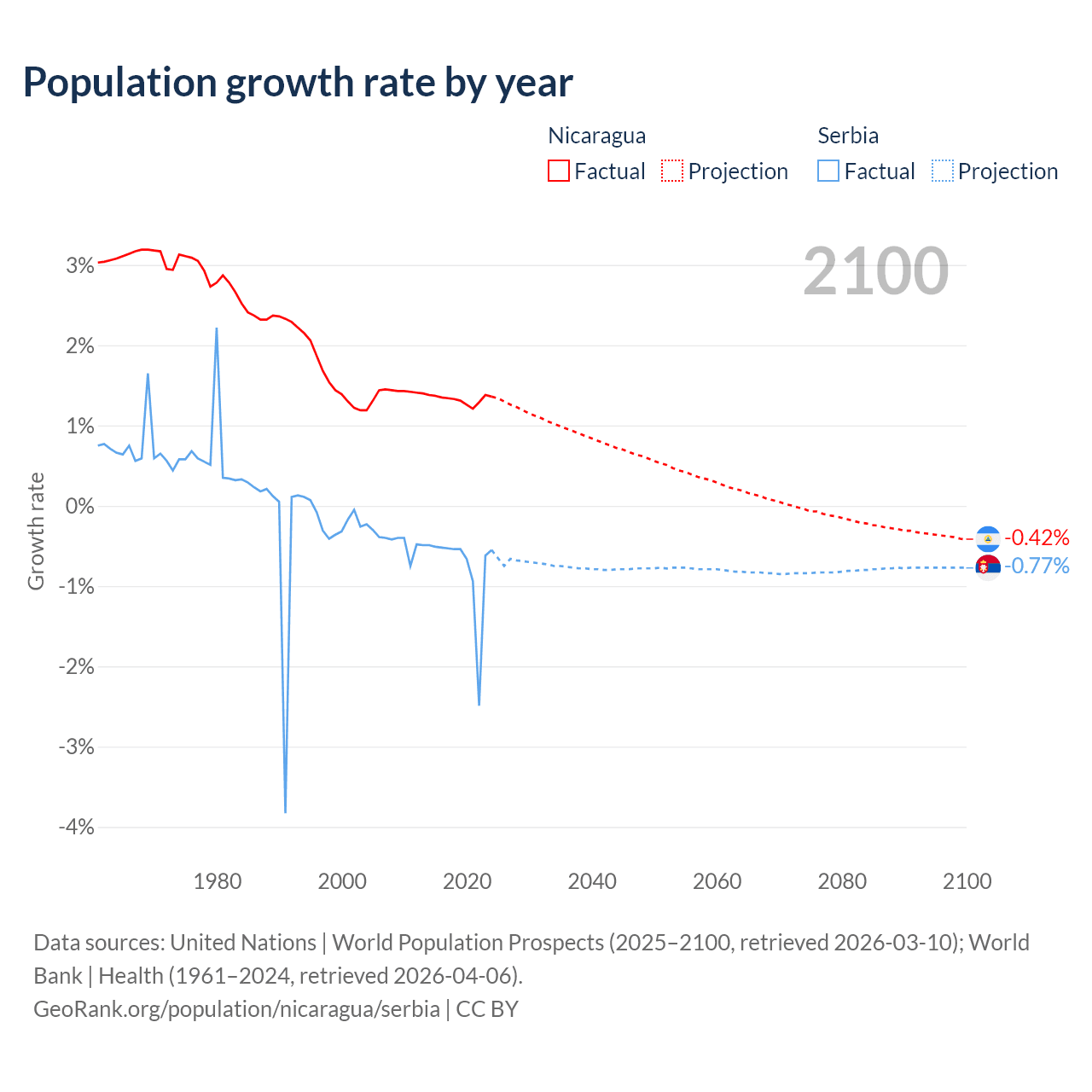 - For the last 10 years, Nicaragua has had an average growth rate of +1.33% per year vs -0.76% in Serbia.
