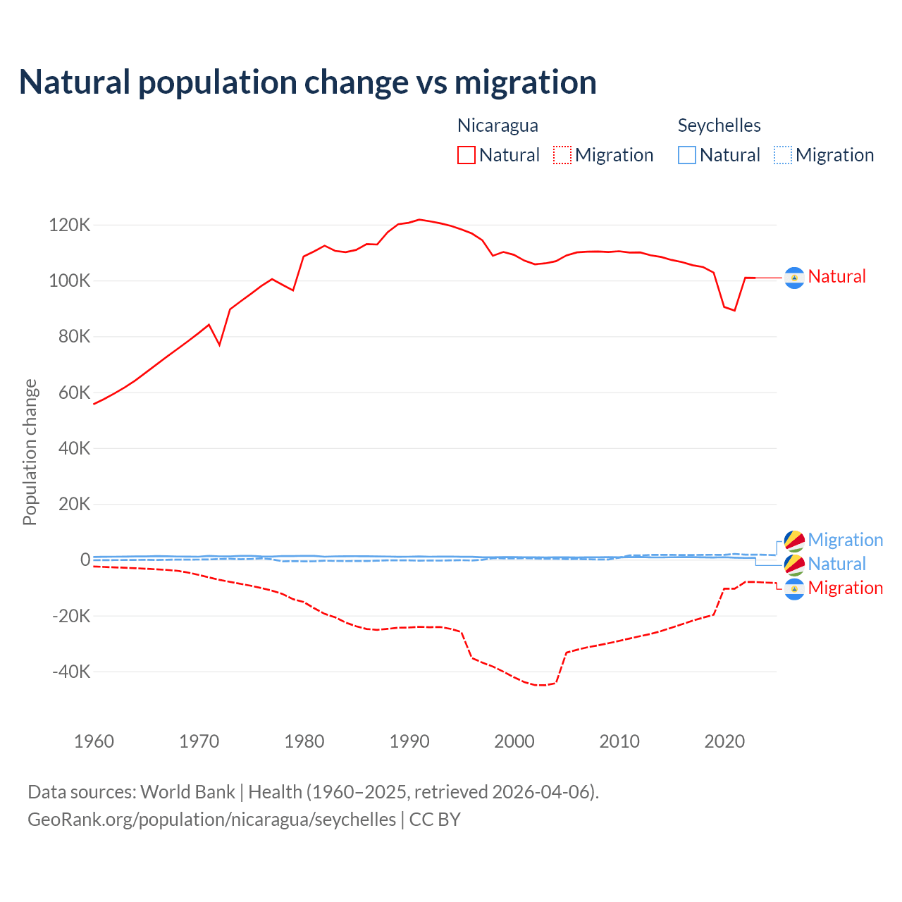 Over the last 10 years, 85.5% of the population change in Nicaragua is from natural causes (a gain of 1,017,084 people) and 14.5% is from migration (a loss of 172,078 people). In the Seychelles 31.4% is from natural causes (a gain of 8,122 people) and 68.6% is from migration (a gain of 17,748 people).