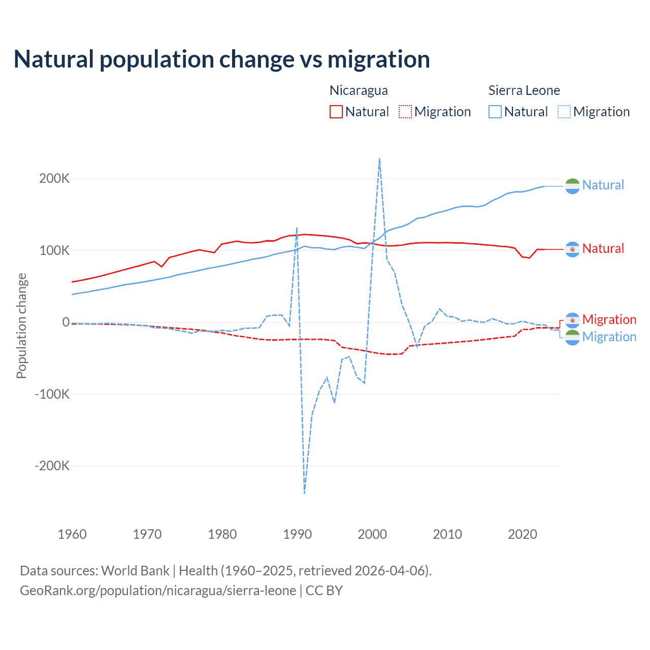Over the last 10 years, 85.5% of the population change in Nicaragua is from natural causes (a gain of 1,017,084 people) and 14.5% is from migration (a loss of 172,078 people). In Sierra Leone 99.6% is from natural causes (a gain of 1,764,049 people) and 0.41% is from migration (a loss of 7,211 people).