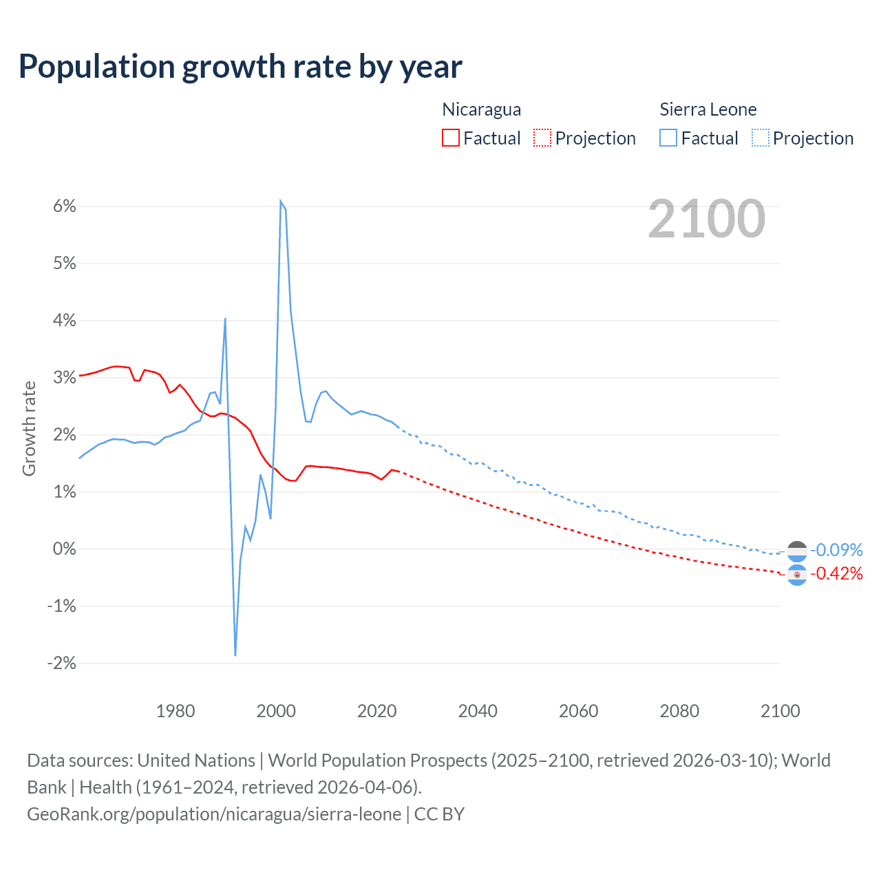 - For the last 10 years, Nicaragua has had an average growth rate of +1.33% per year vs +2.32% in Sierra Leone.