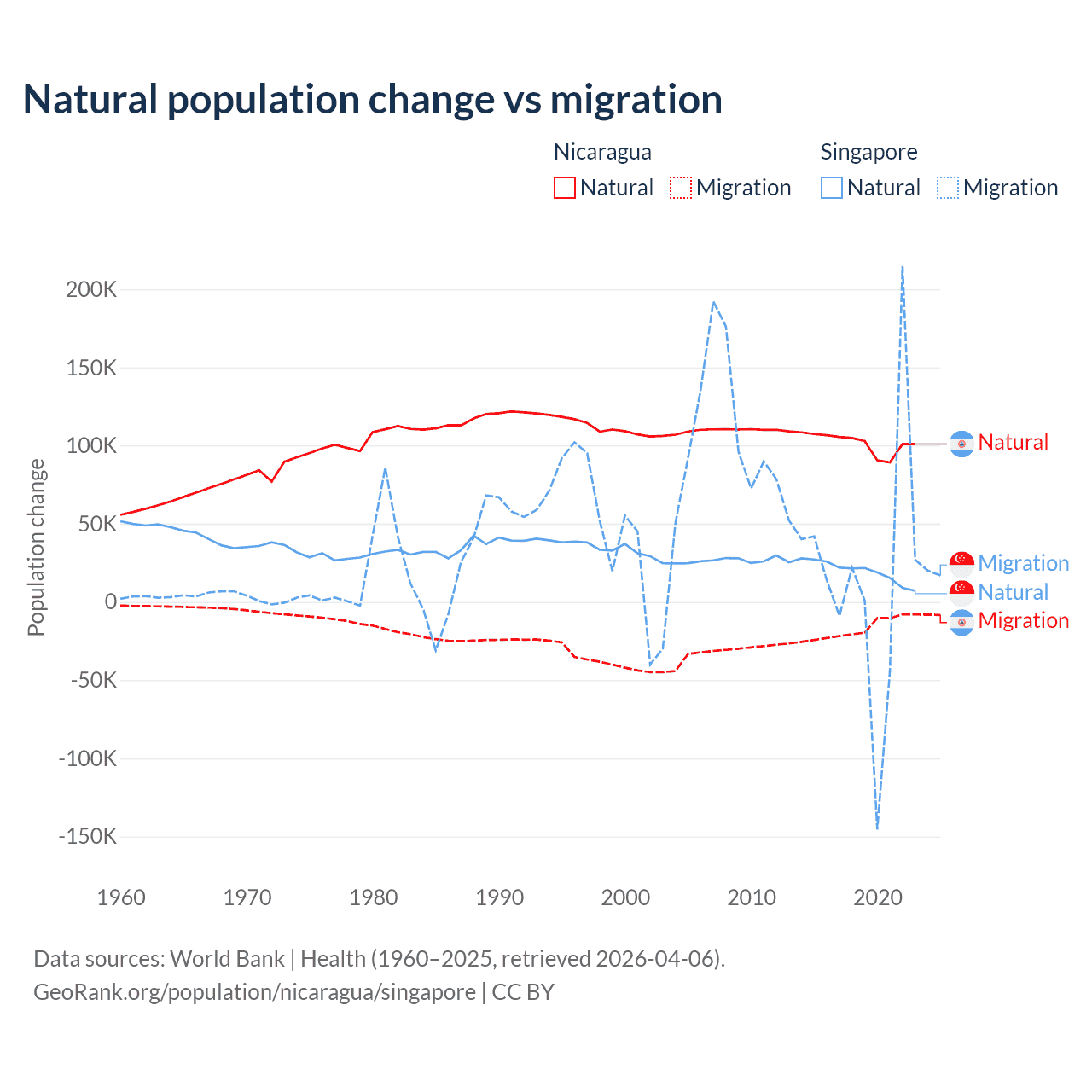 Over the last 10 years, 85.5% of the population change in Nicaragua is from natural causes (a gain of 1,017,084 people) and 14.5% is from migration (a loss of 172,078 people). In Singapore 54.8% is from natural causes (a gain of 195,953 people) and 45.2% is from migration (a gain of 161,805 people).