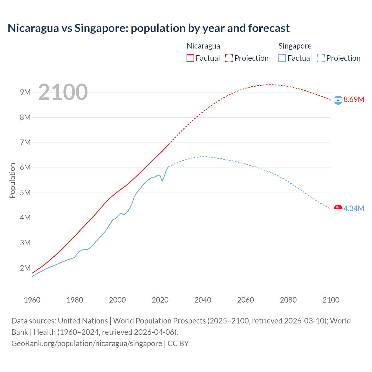 Nicaragua vs Singapore: population by year and forecast