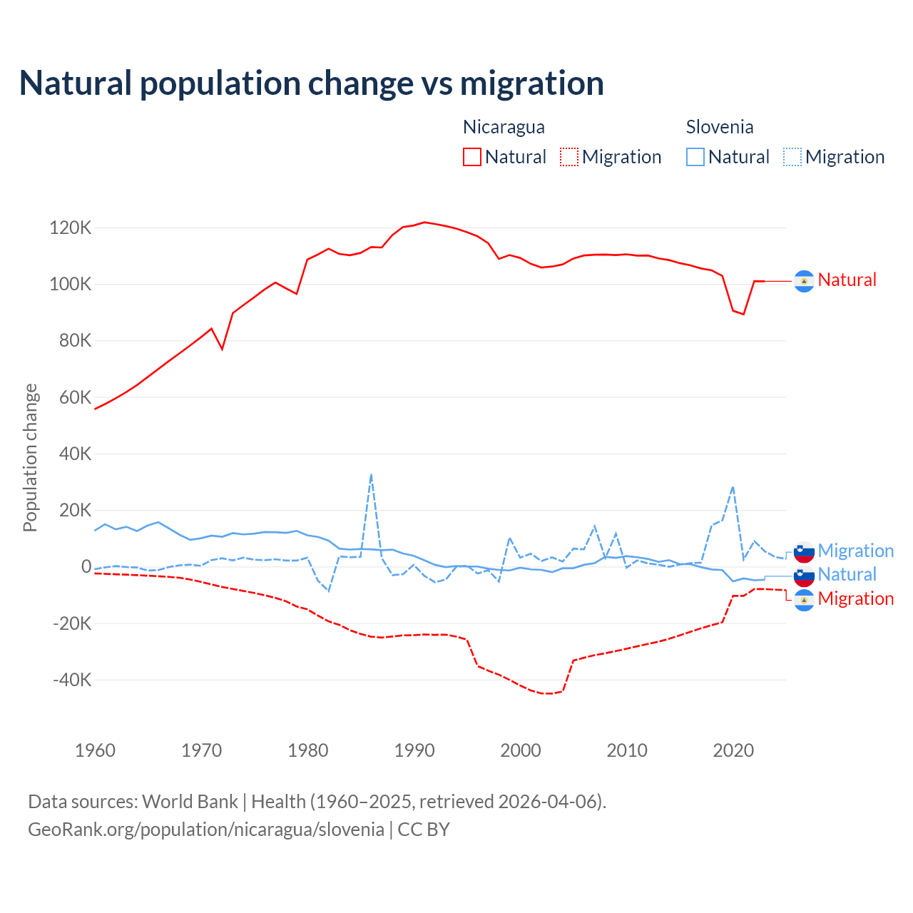Over the last 10 years, 85.5% of the population change in Nicaragua is from natural causes (a gain of 1,017,084 people) and 14.5% is from migration (a loss of 172,078 people). In Slovenia 18.1% is from natural causes (a loss of 17,573 people) and 81.9% is from migration (a gain of 79,532 people).