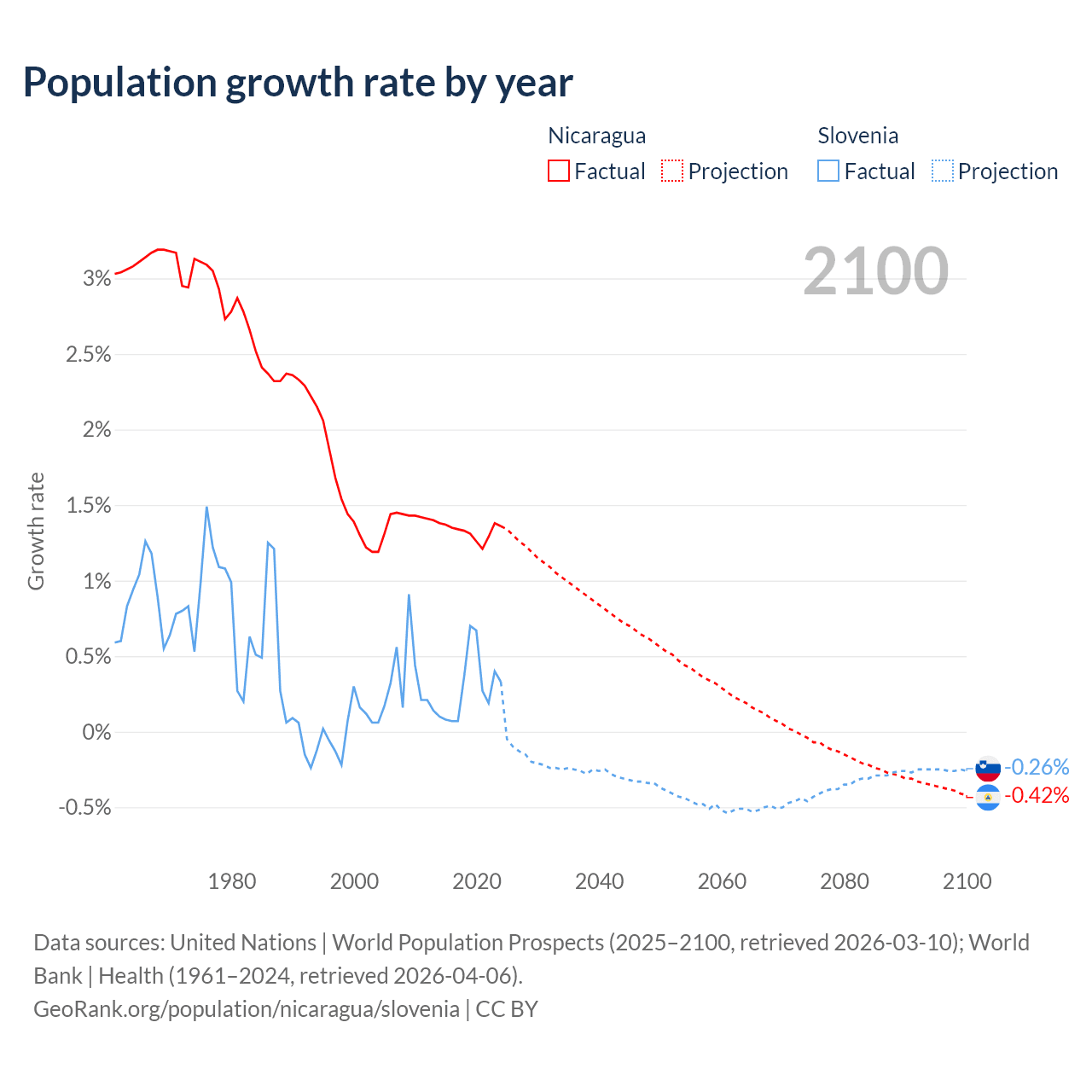 - For the last 10 years, Nicaragua has had an average growth rate of +1.33% per year vs +0.29% in Slovenia.