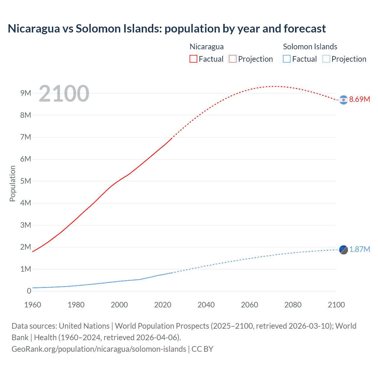 Nicaragua vs Solomon Islands: population by year and forecast