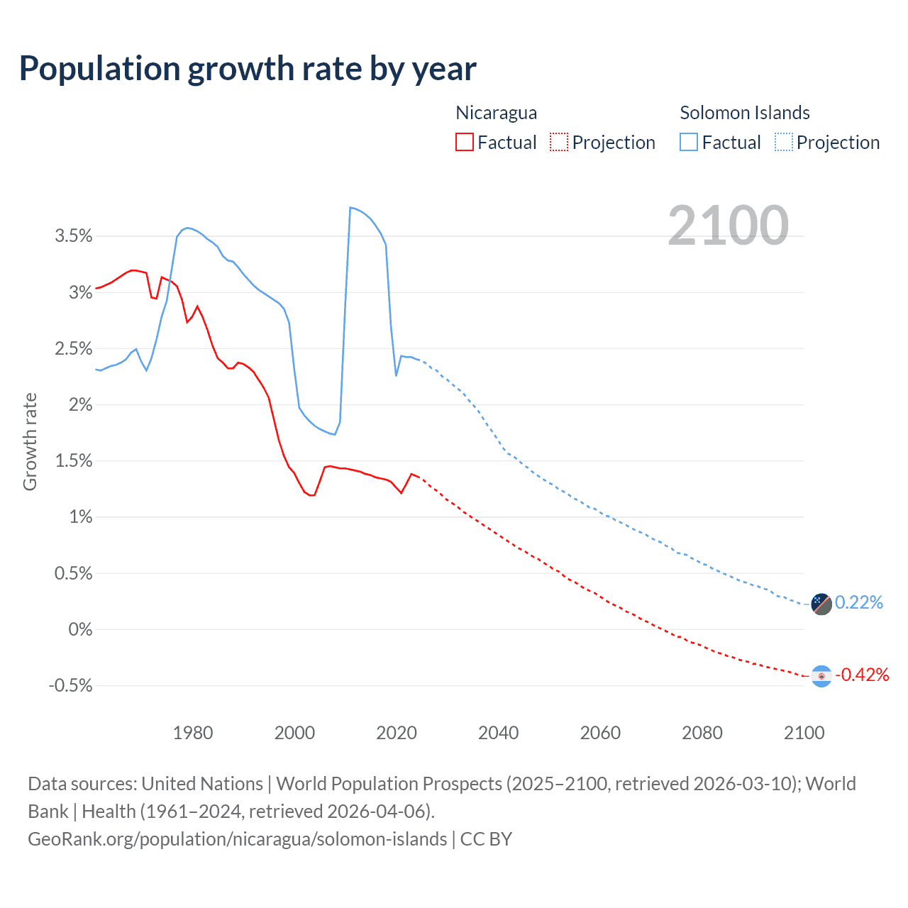 - For the last 10 years, Nicaragua has had an average growth rate of +1.33% per year vs +2.95% in the Solomon Islands.
