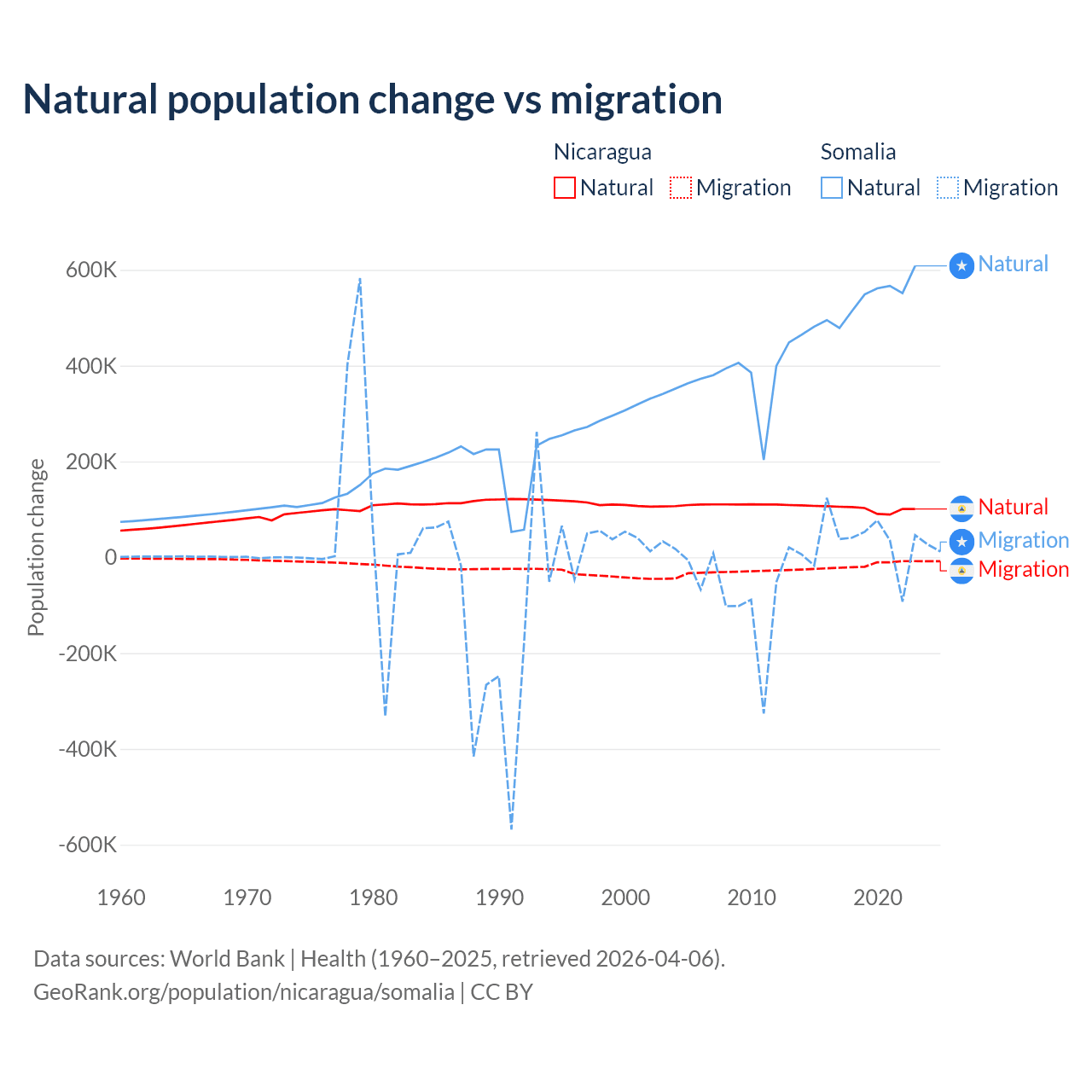 Over the last 10 years, 85.5% of the population change in Nicaragua is from natural causes (a gain of 1,017,084 people) and 14.5% is from migration (a loss of 172,078 people). In Somalia 94.4% is from natural causes (a gain of 5,270,105 people) and 5.58% is from migration (a gain of 311,487 people).