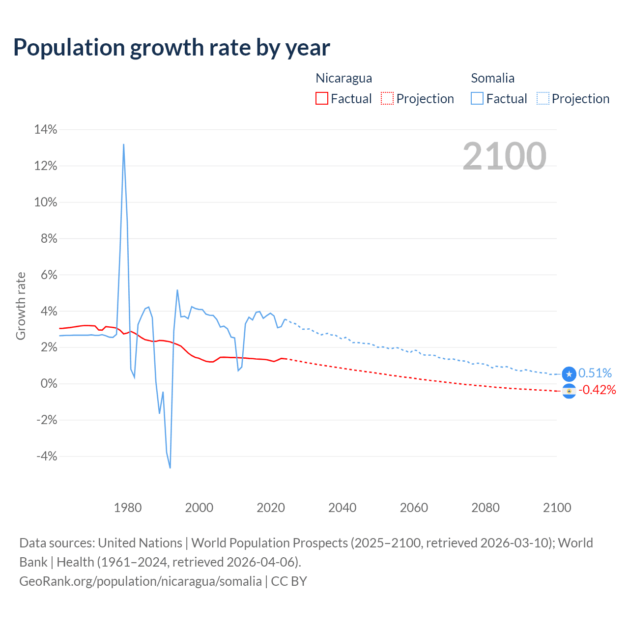 - For the last 10 years, Nicaragua has had an average growth rate of +1.33% per year vs +3.61% in Somalia.