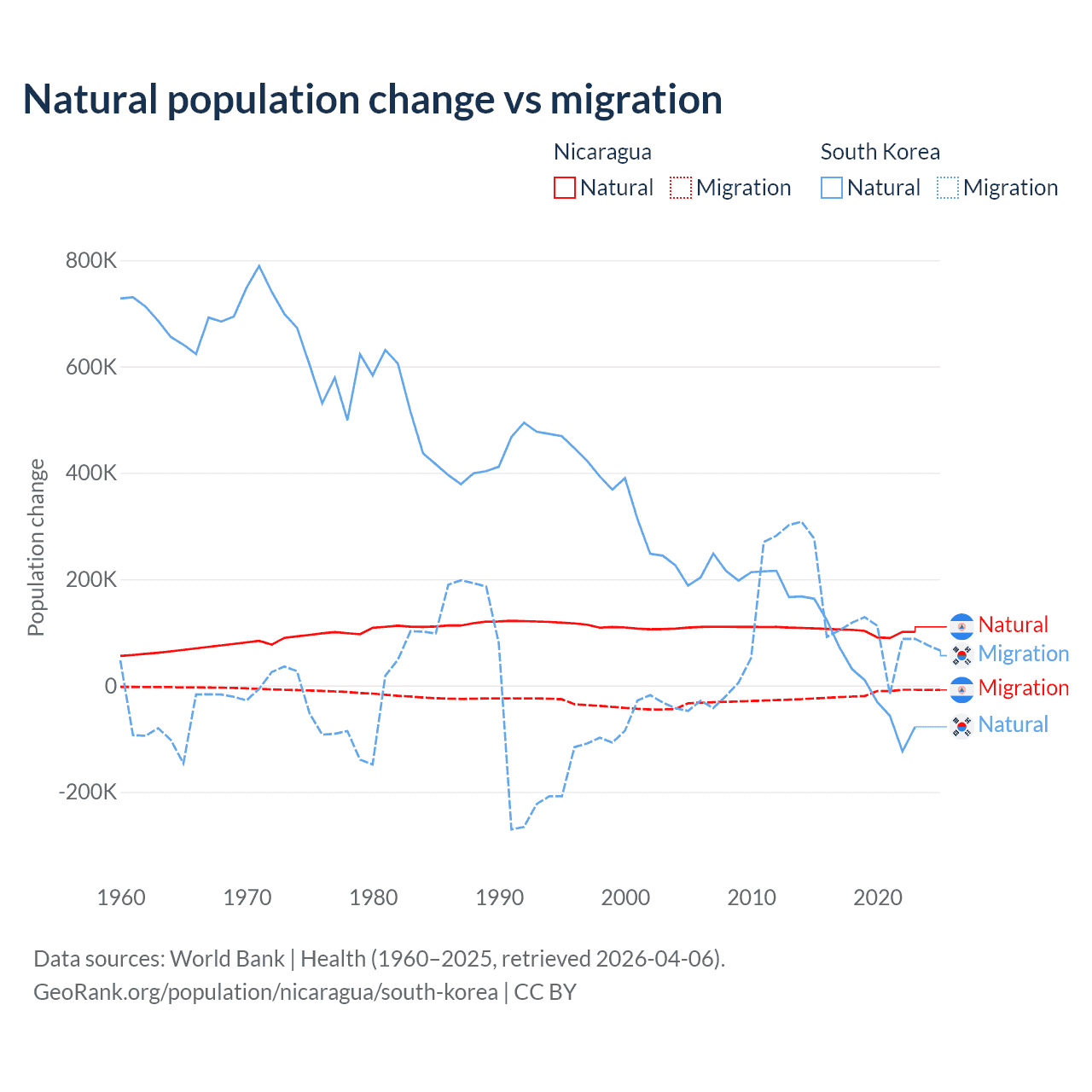 Over the last 10 years, 85.5% of the population change in Nicaragua is from natural causes (a gain of 1,017,084 people) and 14.5% is from migration (a loss of 172,078 people). In South Korea 17.6% is from natural causes (a gain of 277,215 people) and 82.4% is from migration (a gain of 1,298,356 people).