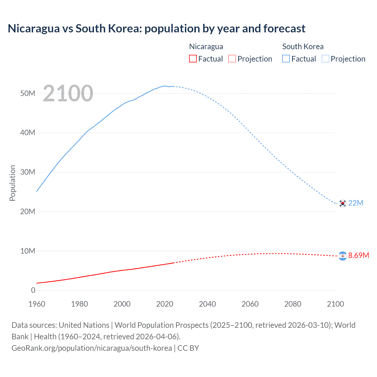 Nicaragua vs South Korea: population by year and forecast