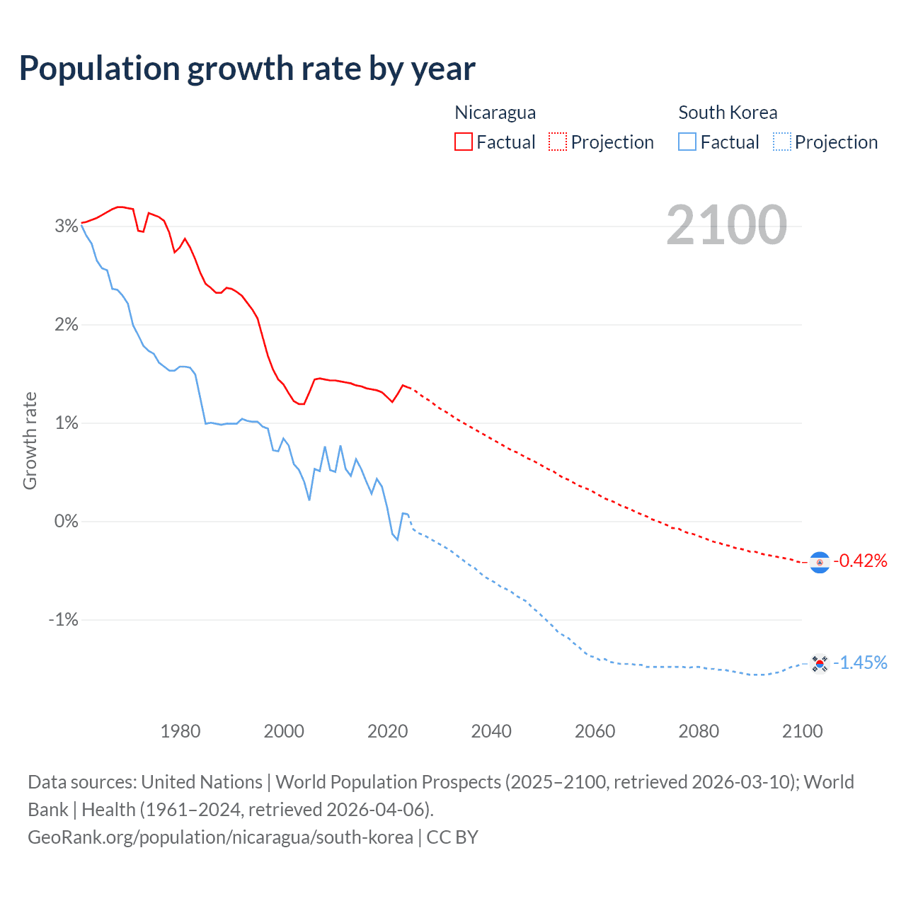 - For the last 10 years, Nicaragua has had an average growth rate of +1.33% per year vs +0.24% in South Korea.