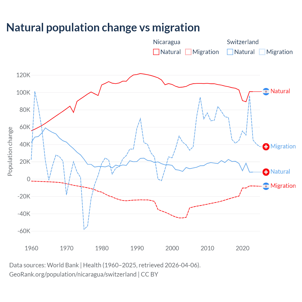 Over the last 10 years, 85.5% of the population change in Nicaragua is from natural causes (a gain of 1,017,084 people) and 14.5% is from migration (a loss of 172,078 people). In Switzerland 21.6% is from natural causes (a gain of 165,354 people) and 78.4% is from migration (a gain of 600,145 people).