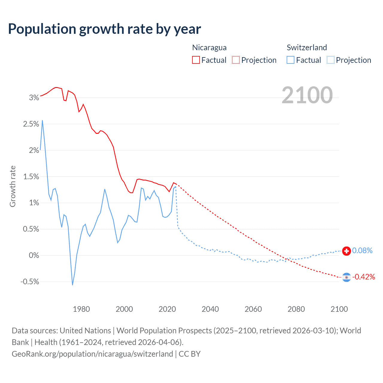 - For the last 10 years, Nicaragua has had an average growth rate of +1.33% per year vs +0.98% in Switzerland.