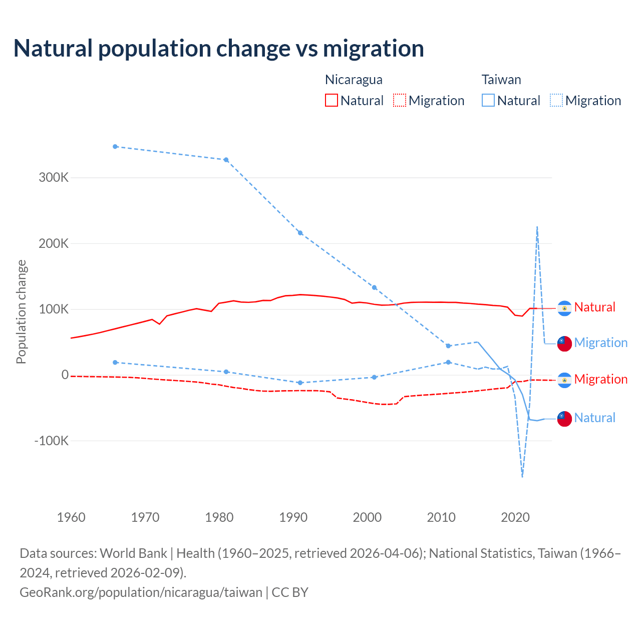 Over the last 10 years, 85.5% of the population change in Nicaragua is from natural causes (a gain of 1,017,084 people) and 14.5% is from migration (a loss of 172,078 people). In Taiwan 56.7% is from natural causes (a loss of 57,467 people) and 43.3% is from migration (a gain of 43,884 people).