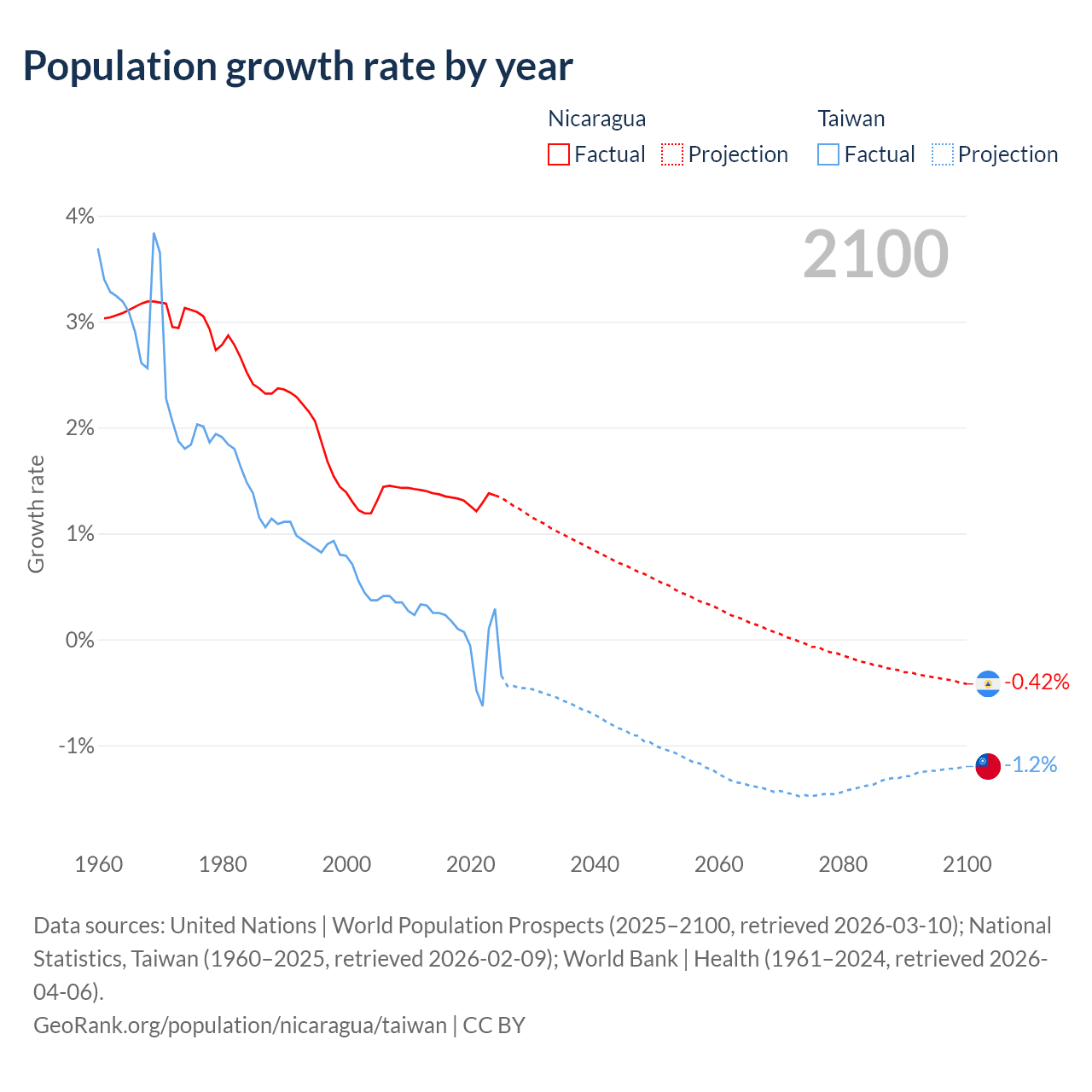 Data sources: World Bank | Health (1960–2024, retrieved 2026-04-06); United Nations | World Population Prospects (1960–2026, retrieved 2026-03-10); U.S. Census Bureau (1960–2025, retrieved 2026-02-08); National Statistics, Taiwan (1960–2025, retrieved 2026-02-09); Central Intelligence Agency (CIA) (2000–2019, retrieved 2026-02-20).