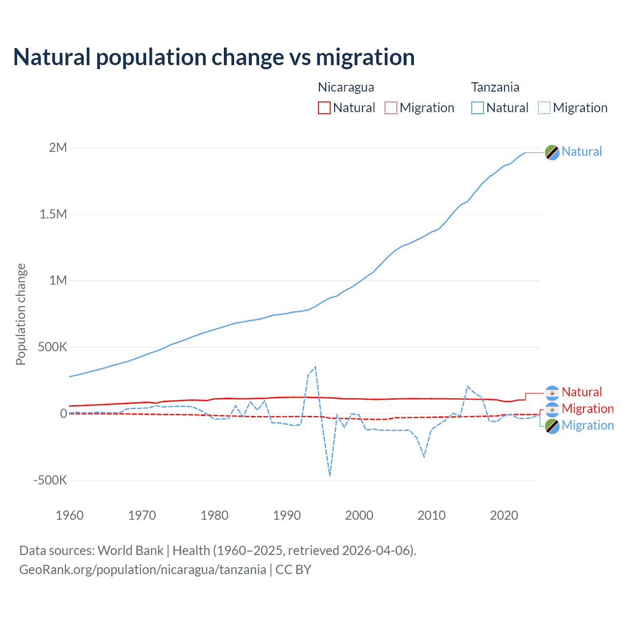 Over the last 10 years, 85.5% of the population change in Nicaragua is from natural causes (a gain of 1,017,084 people) and 14.5% is from migration (a loss of 172,078 people). In Tanzania 98.7% is from natural causes (a gain of 17,769,541 people) and 1.27% is from migration (a gain of 229,466 people).