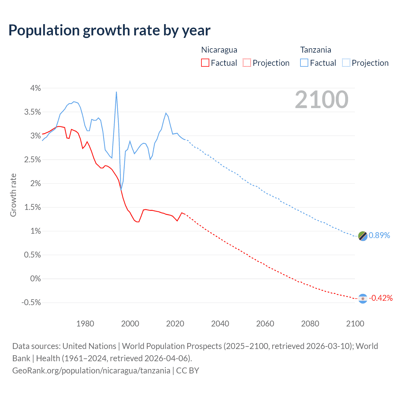 - For the last 10 years, Nicaragua has had an average growth rate of +1.33% per year vs +3.13% in Tanzania.