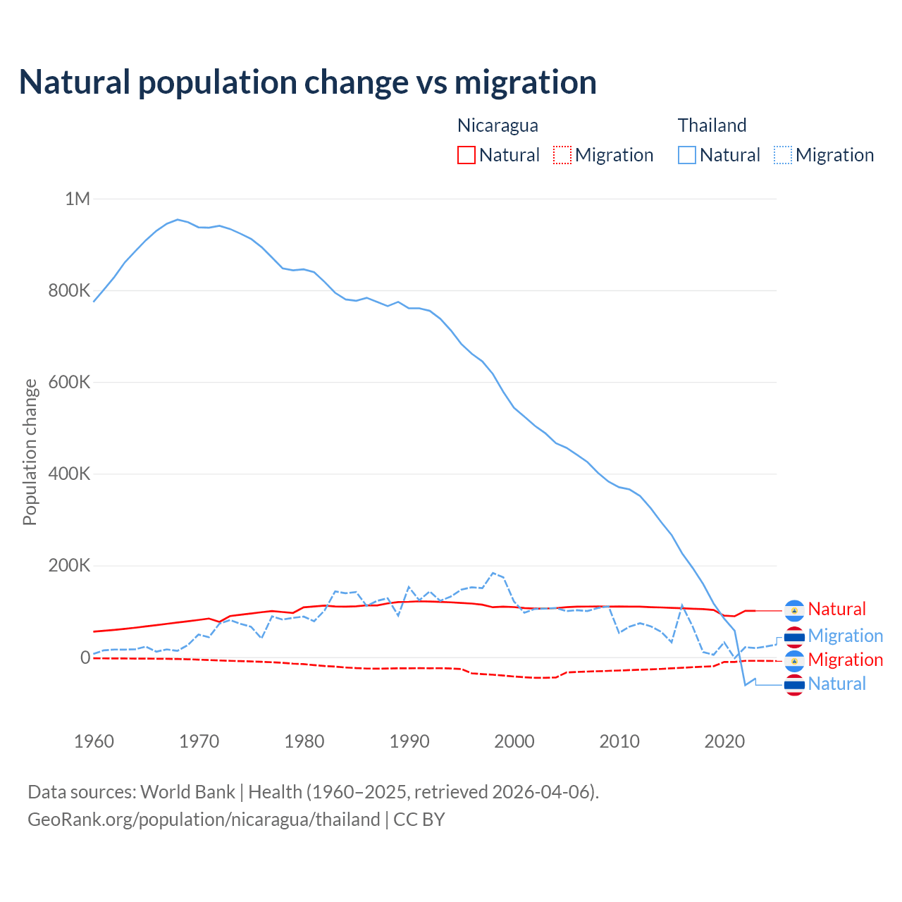 Over the last 10 years, 85.5% of the population change in Nicaragua is from natural causes (a gain of 1,017,084 people) and 14.5% is from migration (a loss of 172,078 people). In Thailand 78.4% is from natural causes (a gain of 1,292,528 people) and 21.6% is from migration (a gain of 355,361 people).