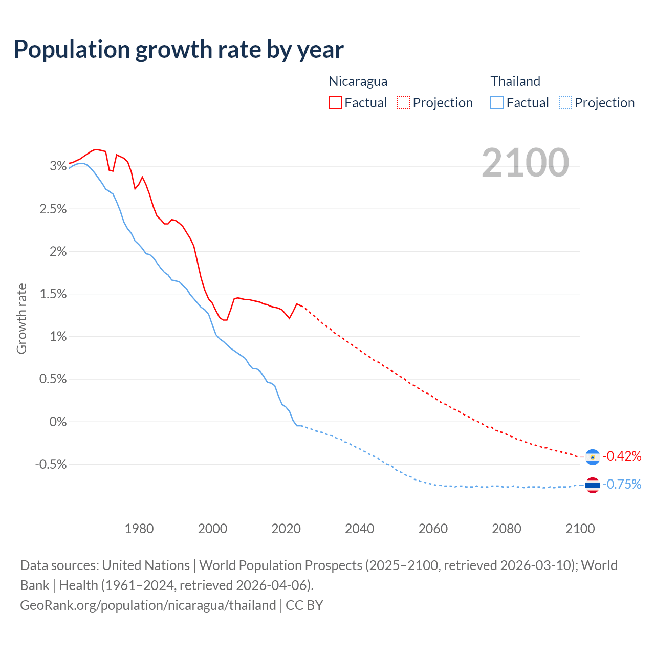 - For the last 10 years, Nicaragua has had an average growth rate of +1.33% per year vs +0.23% in Thailand.