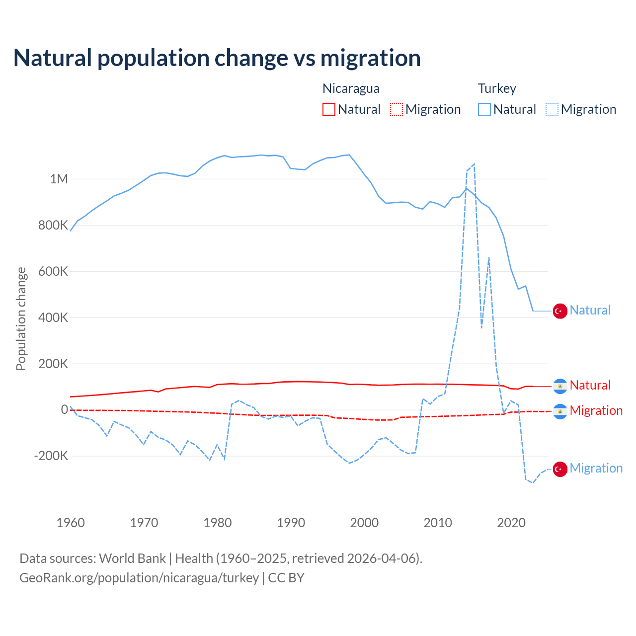 Over the last 10 years, 85.5% of the population change in Nicaragua is from natural causes (a gain of 1,017,084 people) and 14.5% is from migration (a loss of 172,078 people). In Turkey 73% is from natural causes (a gain of 7,333,352 people) and 27% is from migration (a gain of 2,718,916 people).
