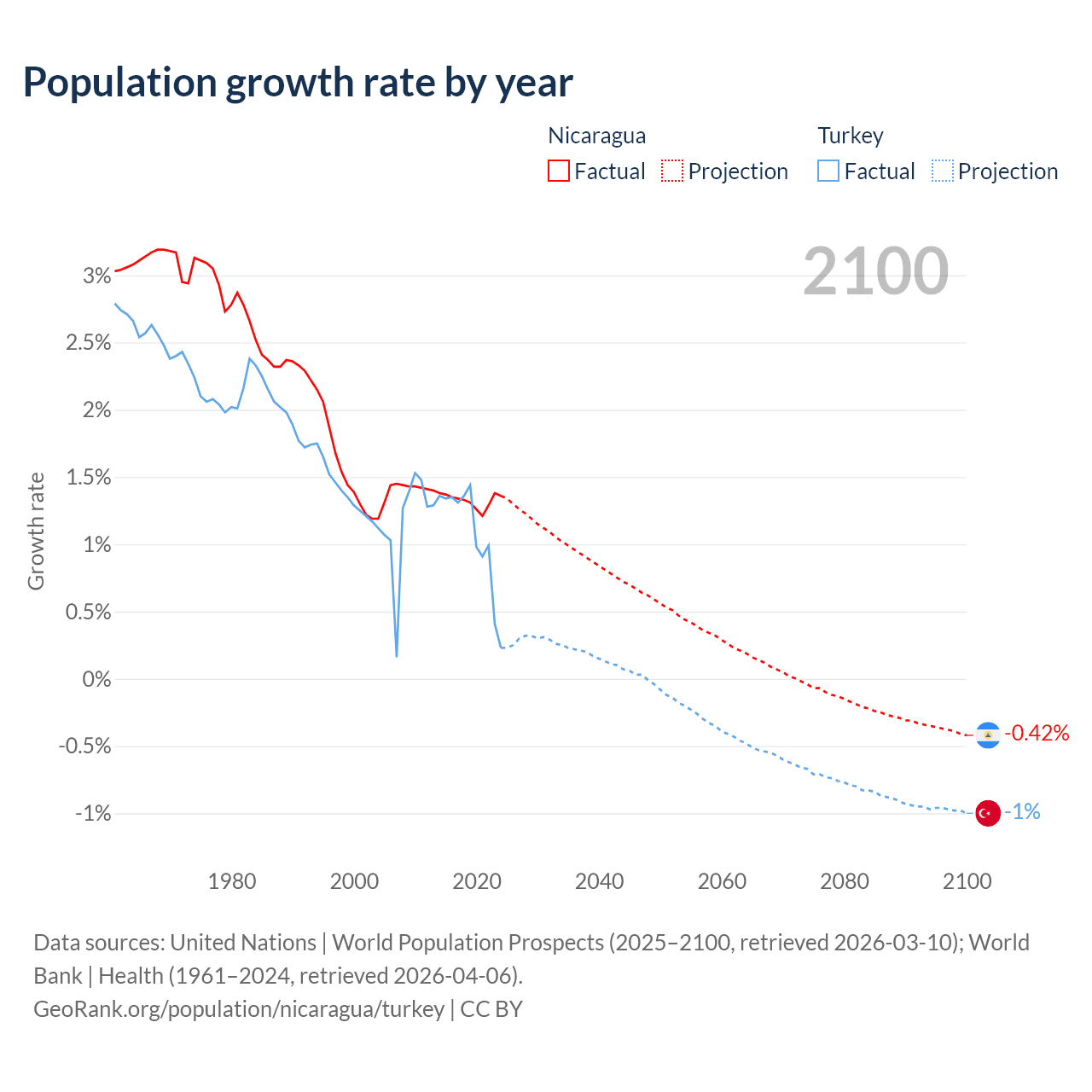 - For the last 10 years, Nicaragua has had an average growth rate of +1.33% per year vs +1.06% in Turkey.
