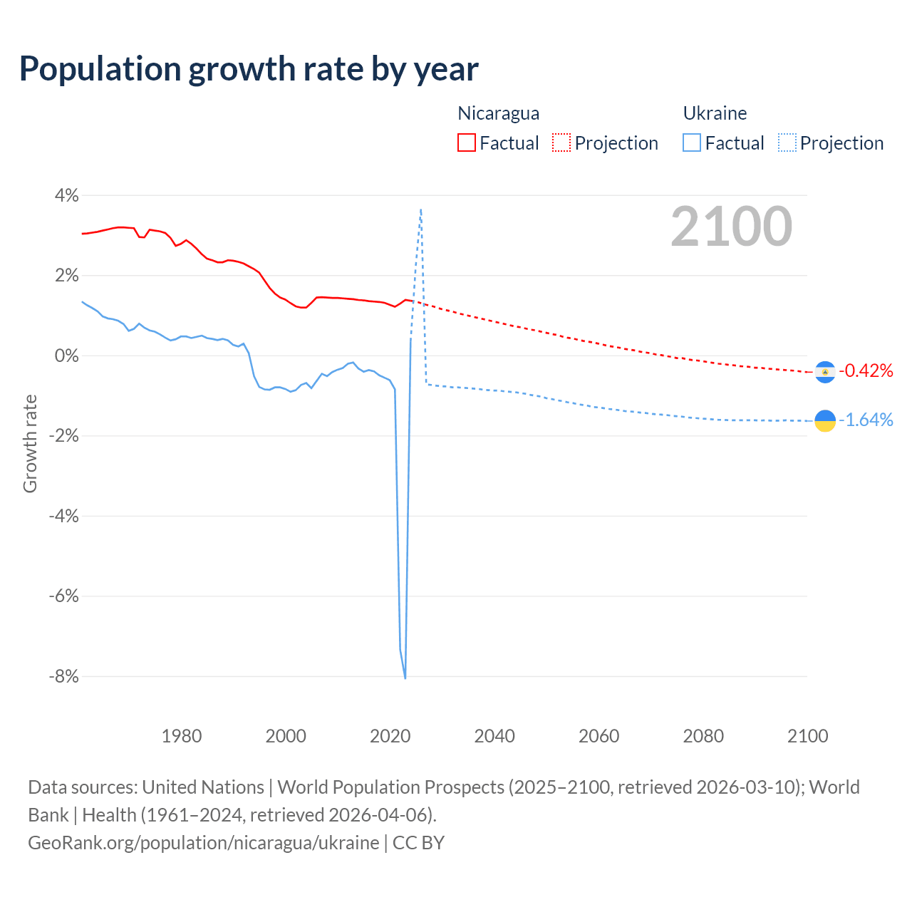 - For the last 10 years, Nicaragua has had an average growth rate of +1.33% per year vs -1.74% in Ukraine.
