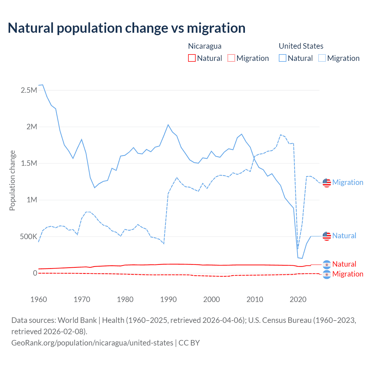 Data sources: World Bank | Health (1960–2025, retrieved 2026-04-06); U.S. Census Bureau (1960–2023, retrieved 2026-02-08).