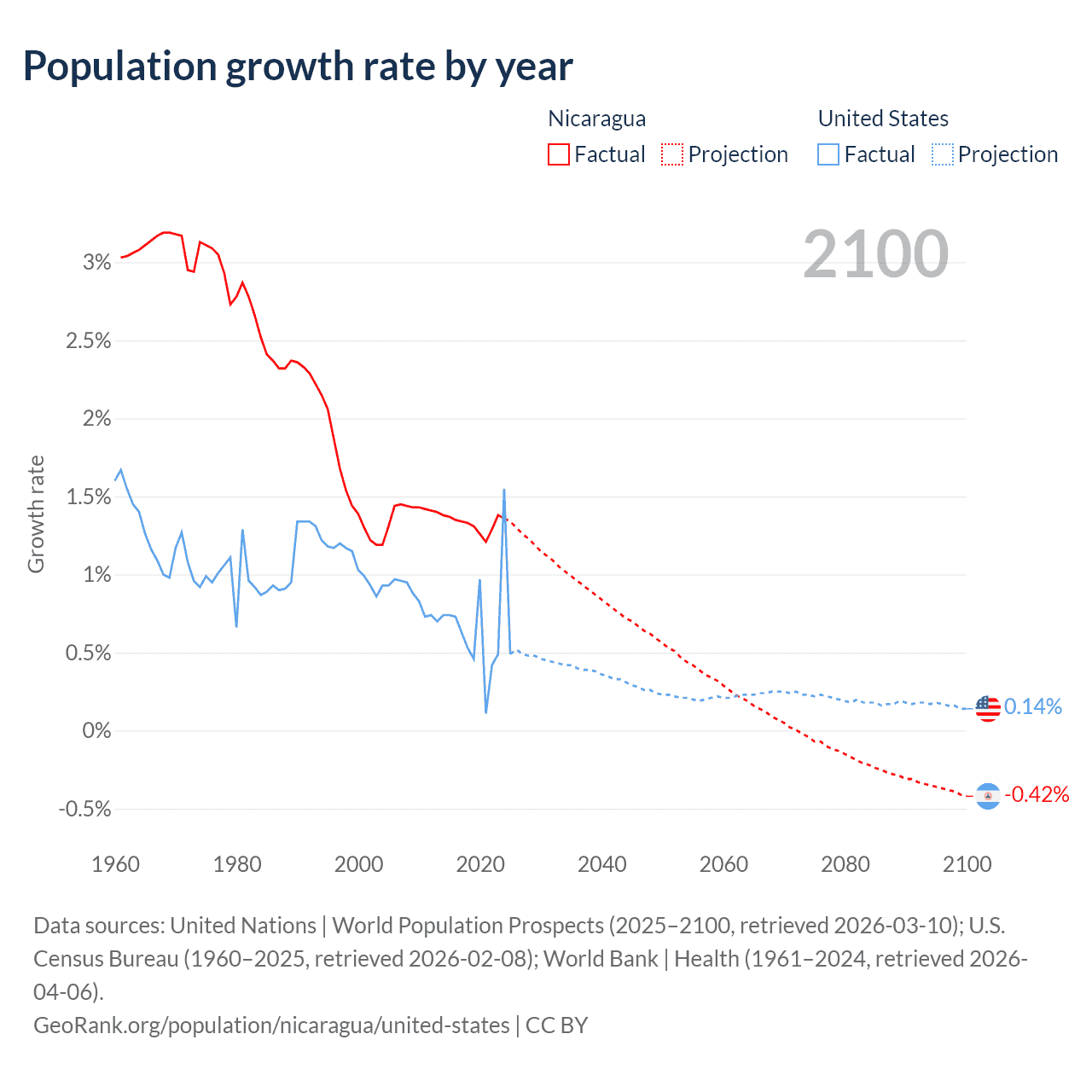 Data sources: World Bank | Health (1960–2024, retrieved 2026-04-06); United Nations | World Population Prospects (1960–2026, retrieved 2026-03-10); U.S. Census Bureau (1960–2025, retrieved 2026-02-08); Central Intelligence Agency (CIA) (2000–2019, retrieved 2026-02-20).