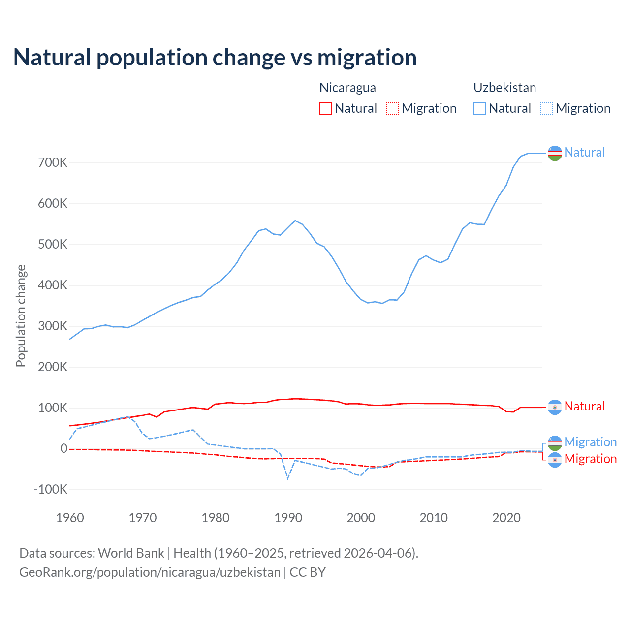 Over the last 10 years, 85.5% of the population change in Nicaragua is from natural causes (a gain of 1,017,084 people) and 14.5% is from migration (a loss of 172,078 people). In Uzbekistan 98.2% is from natural causes (a gain of 6,161,117 people) and 1.84% is from migration (a loss of 115,398 people).