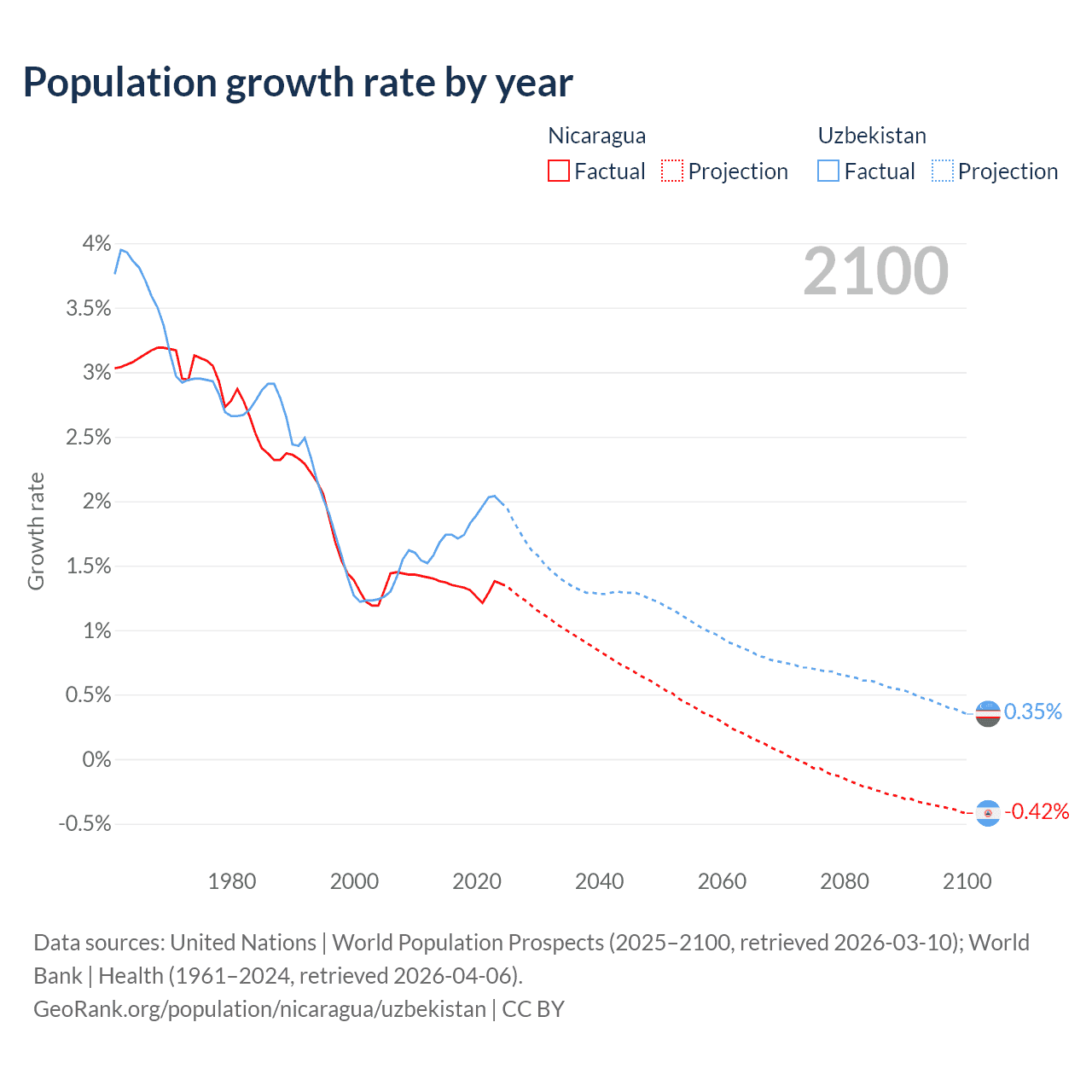 Data sources: World Bank | Health (1960–2024, retrieved 2026-04-06); United Nations | World Population Prospects (1960–2026, retrieved 2026-03-10); U.S. Census Bureau (1960–2025, retrieved 2026-02-08); Central Intelligence Agency (CIA) (2000–2019, retrieved 2026-02-20).