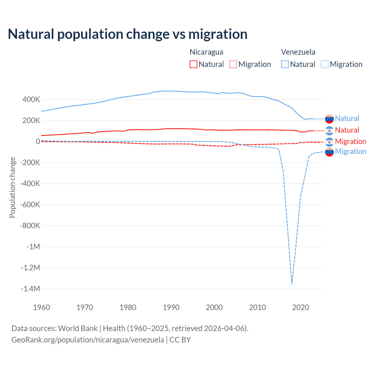 Over the last 10 years, 85.5% of the population change in Nicaragua is from natural causes (a gain of 1,017,084 people) and 14.5% is from migration (a loss of 172,078 people). In Venezuela 38.6% is from natural causes (a gain of 2,946,257 people) and 61.4% is from migration (a loss of 4,683,227 people).