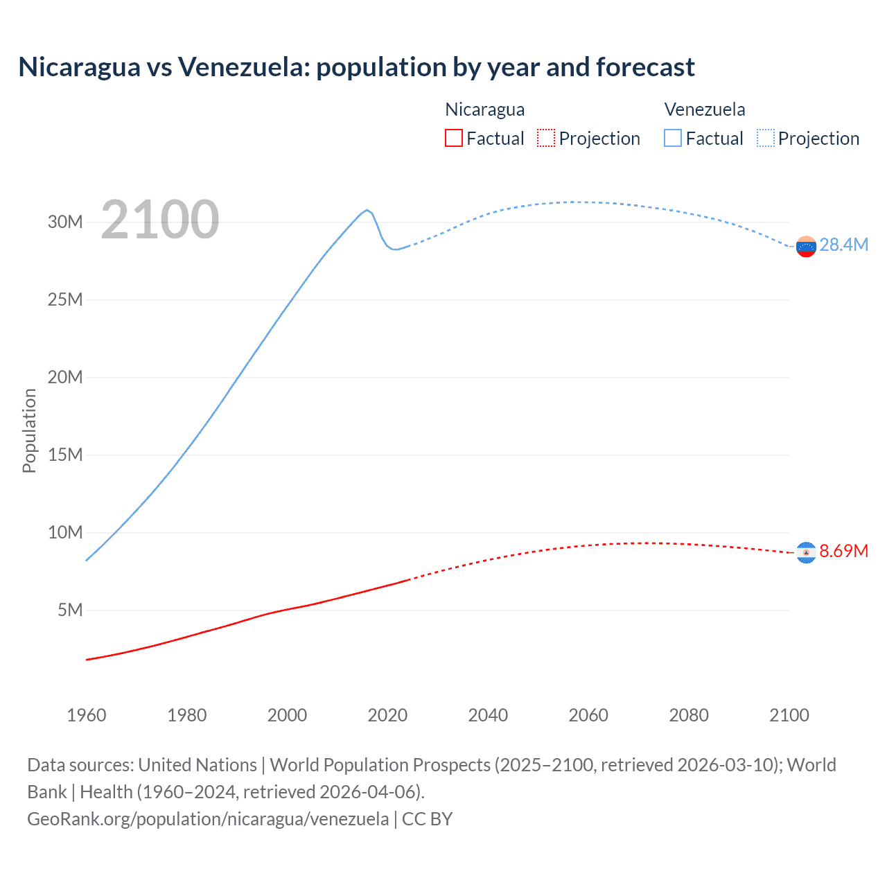 Nicaragua vs Venezuela: population by year and forecast