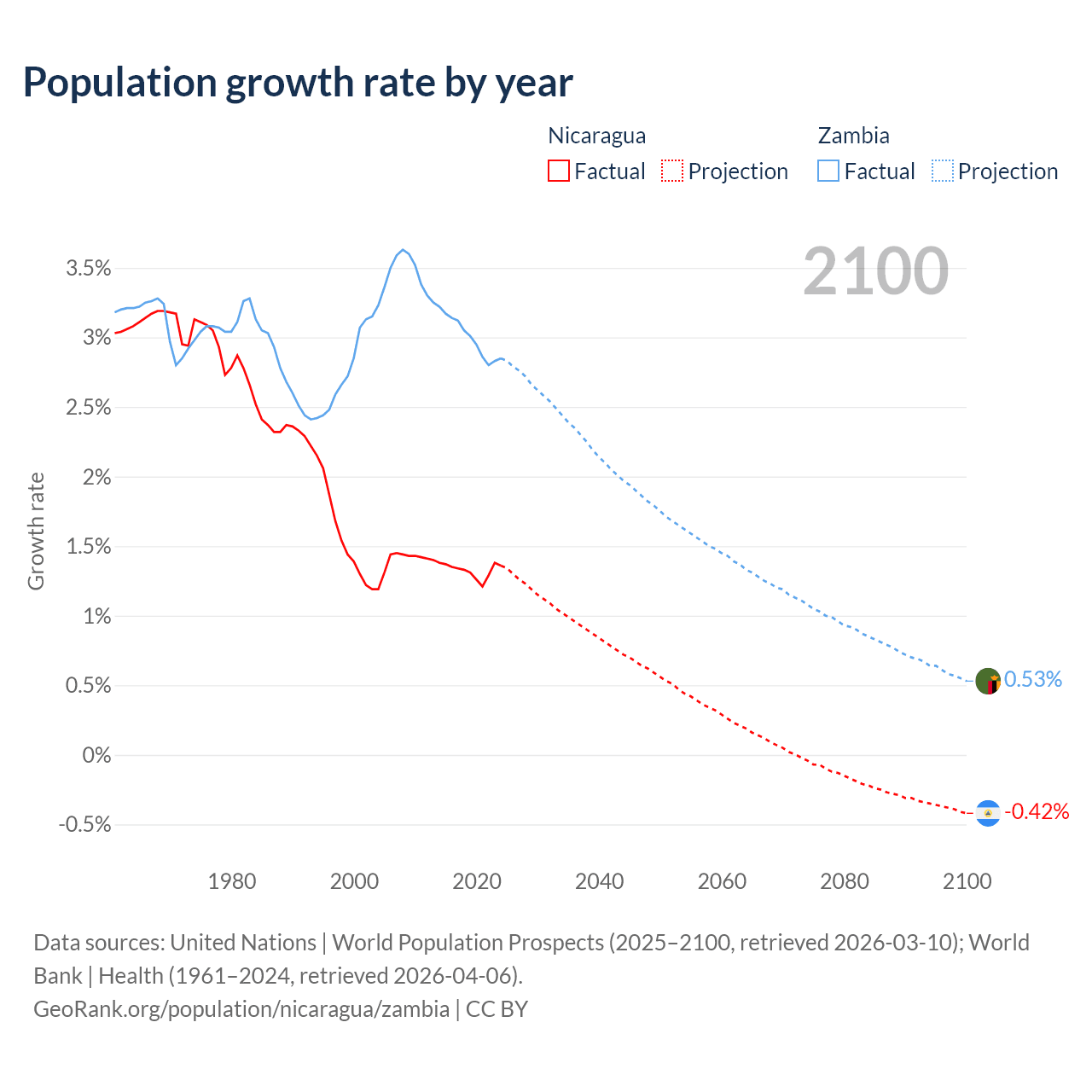 - For the last 10 years, Nicaragua has had an average growth rate of +1.33% per year vs +3% in Zambia.