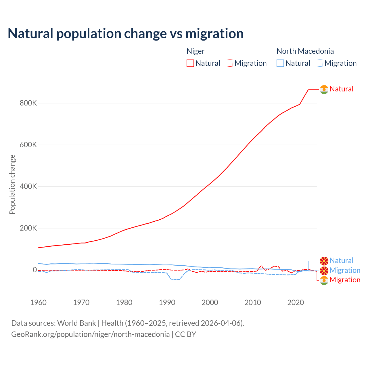 Over the last 10 years, 100% of the population change in Niger is from natural causes (a gain of 7,728,287 people) and 0.03% is from migration (a gain of 2,520 people). In North Macedonia 6.45% is from natural causes (a loss of 12,585 people) and 93.5% is from migration (a loss of 182,429 people).