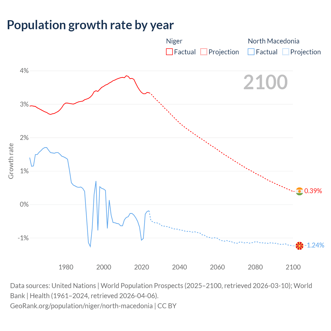 - For the last 10 years, Niger has had an average growth rate of +3.5% per year vs -0.48% in North Macedonia.