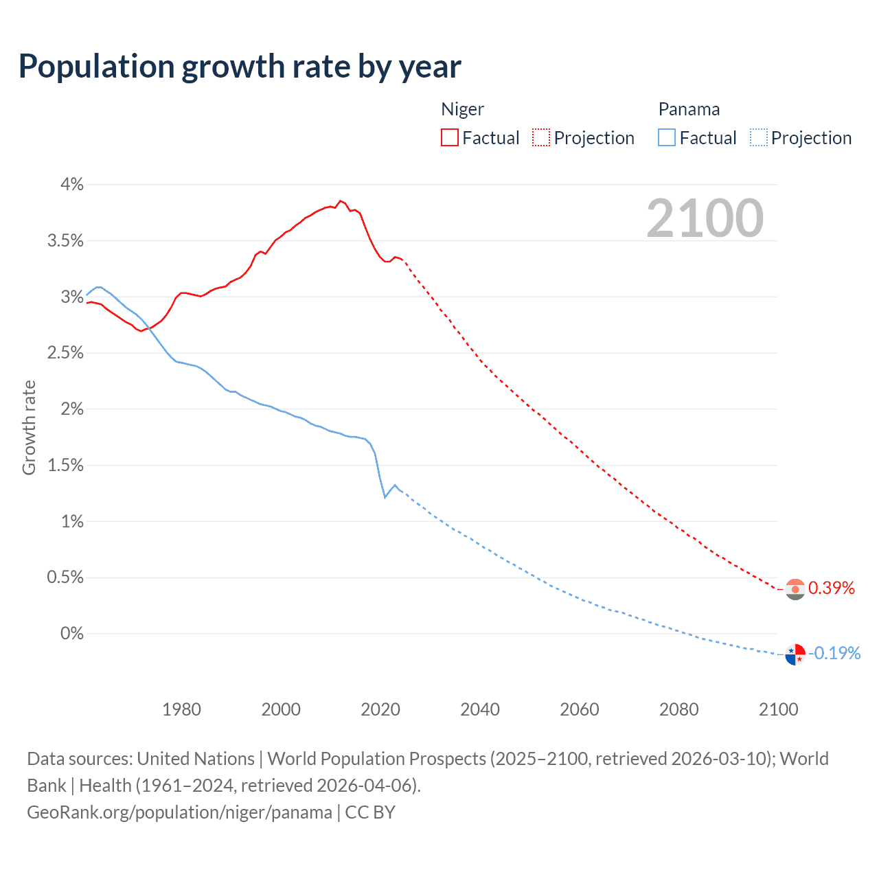 - For the last 10 years, Niger has had an average growth rate of +3.5% per year vs +1.52% in Panama.
