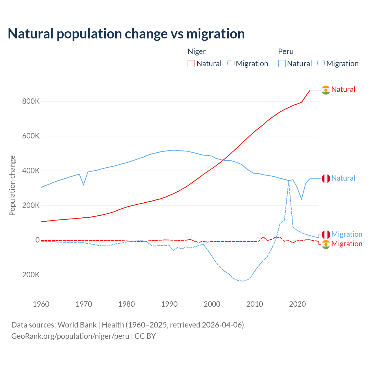 Over the last 10 years, 100% of the population change in Niger is from natural causes (a gain of 7,728,287 people) and 0.03% is from migration (a gain of 2,520 people). In Peru 82% is from natural causes (a gain of 3,345,822 people) and 18% is from migration (a gain of 732,505 people).