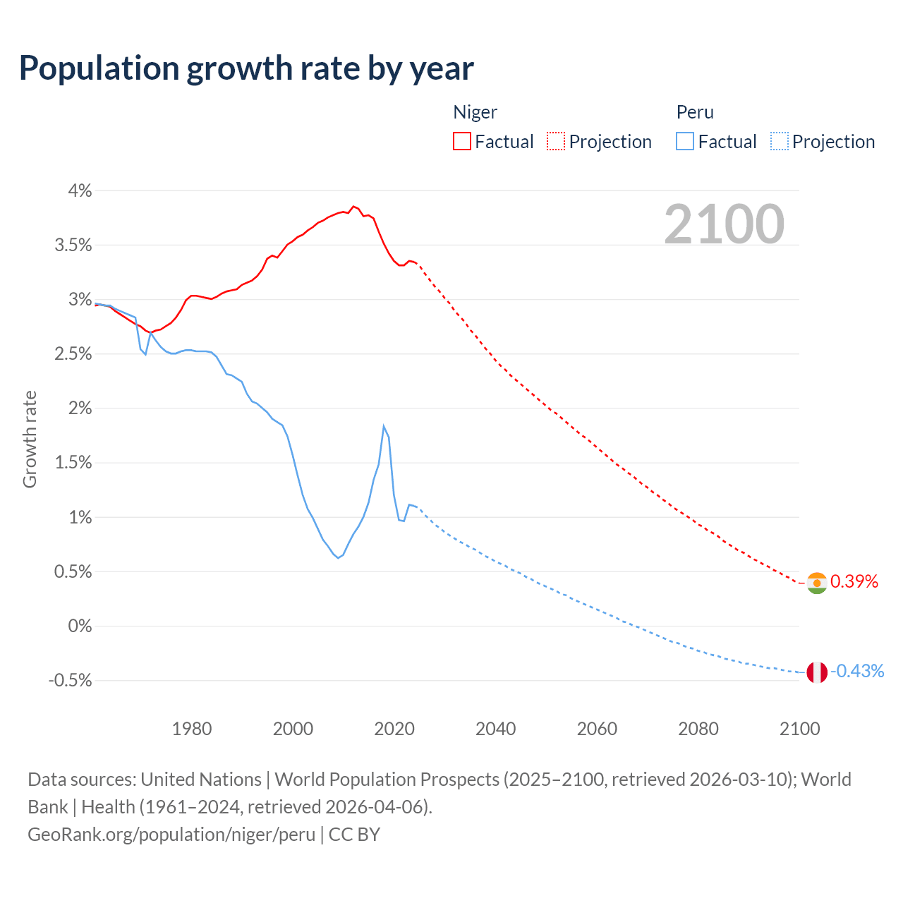 - For the last 10 years, Niger has had an average growth rate of +3.5% per year vs +1.26% in Peru.